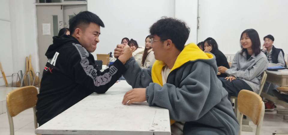 本次比赛采取守擂打擂的方式,本着公平、公正、公开的原则进行,同学们踊跃参加。伴随着主持人的开场白结束,参赛选手们都摆出了龙争虎斗之势,比赛场面相当激烈,选手们的豪迈的气势、精湛的技艺博得了在场同学的鼓掌与喝彩。最终音乐学2020-1班赵家豪、产品设计2020-2班邵冠杰、产品设计2020-2班武三栋赢得三次掰手腕擂台的冠军。