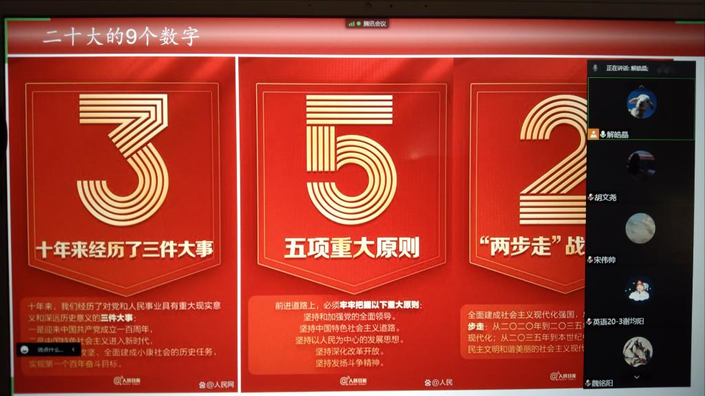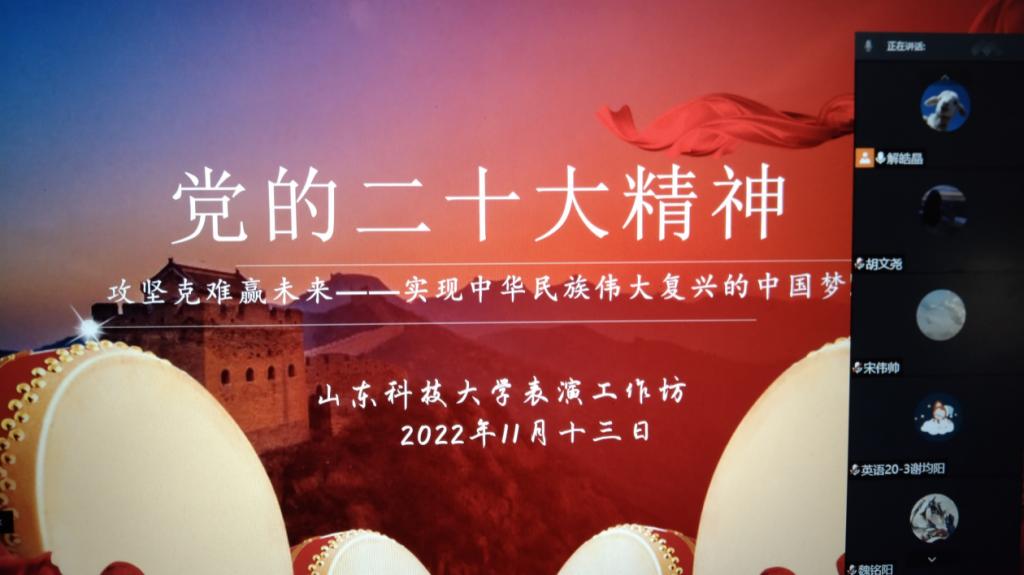 11月13日晚,为深入学习贯彻党的二十大精神,激励青年学生心系国家事、肩扛国家责,表演工作坊开展线上“学习二十大,永远跟党走,奋进新征程”主题活动,社团全体成员参加。