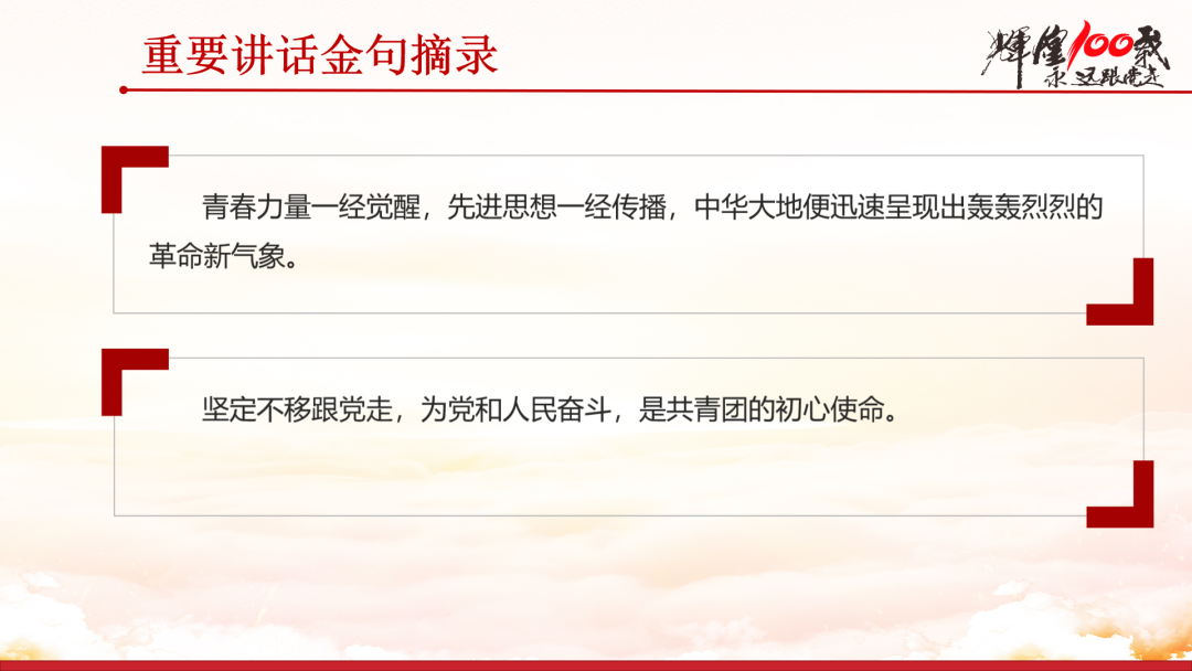 首先,负责人杨淼播放了习近平主席在庆祝中国共产主义青年团成立100周年大会中重点部分的视频,让同学们牢记习近平主席对青年和共青团提出希望,郭琪同学做重要讲话的金句摘录。经讨论,大家总结出习近平主席的重要讲话分为以下五个部分:全面回顾了100年来共青团坚定不移听党话、跟党走的青春历程;充分肯定了共青团在党的领导下、团结带领一代代团员青年为实现中华民族伟大复兴的中国梦所作出的贡献;深刻阐明了共青团和青年工作的历史经验;对当代青年寄予殷切期望;对做好新时代共青团工作提出明确要求。活动最后,负责人杨淼说道:新时代的中国青年,生逢其时、重任在肩,施展才干的舞台无比广阔,作为新时代的青年,我们要牢记国家交给我们的重任,跟随党的步伐,努力为实现中华民族伟大复兴做出自己的贡献!