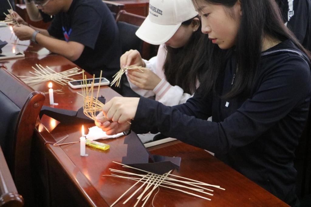 活动开始,宋老师通过介绍竹编文化、竹编历史、竹编分类、竹编工艺流程以及竹编基本知识,带领大家感受竹编独特魅力。随后,宋老师将材料分发给大家,并讲解编制过程及注意事项,配合细致的演示,同学们沉浸式体验了竹编“排、压、穿、烧”的制作过程。同学们小心细致地将竹条穿插成四角孔编,用蜡烛将其烧制出弧度,不一会儿外形精美、栩栩如生的竹编文创产品就编好了。最后,大家互相展示自己的作品并互相分享竹编活动中带来的无穷乐趣。参加活动的武怡然同学说:“没想到小小的竹子竟然可以做出这么精美的作品,这样的特色活动,不仅让我领略到了非遗文化的魅力,还感受到了匠人严谨认真、坚持不懈的可贵精神,值得我好好学习。”